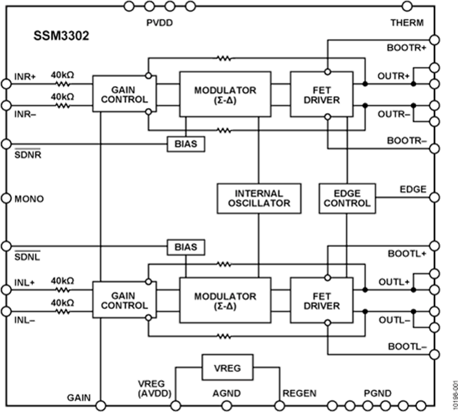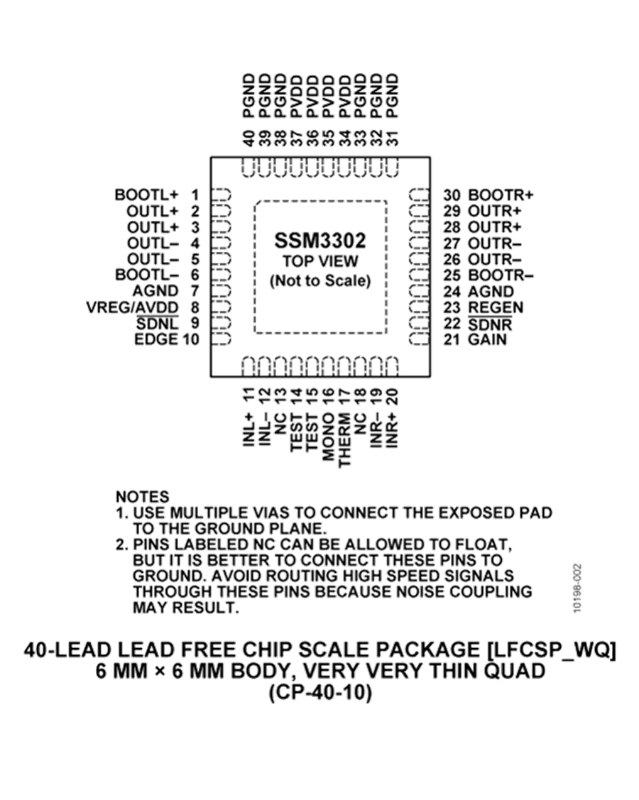 SSM3302的額定溫度范圍為?40°C至+85°C商用溫度范圍。內(nèi)置熱關(guān)斷和輸出短路保護(hù)功能,采用40引腳、6 mm x 6 mm無鹵引腳架構(gòu)芯片級封裝(LFCSP)。