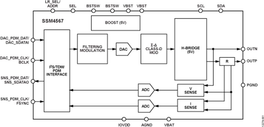 SSM4567是一款數(shù)字輸入D類功率放大器,集成升壓轉(zhuǎn)換器,相比普通電池電源具有更高的輸出功率。 這意味著最大輸出功率在電池電壓范圍內(nèi)是恒定的。 SSM4567是功率敏感應(yīng)用的理想選擇。在功率敏感應(yīng)用中系統(tǒng)噪聲能夠破壞發(fā)送至放大器的小模擬信號(hào),例如移動(dòng)電話、平板電腦和便攜式多媒體播放器。SSM4567在單個(gè)芯片上集成了一個(gè)音頻數(shù)模轉(zhuǎn)換器(DAC)、一個(gè)功率放大器和PDM或PCM (I2S/TDM)數(shù)字音頻接口。 利用SSM4567,音頻能夠以數(shù)字的方式發(fā)送至音頻放大器,從而顯著降低傳輸音頻上噪聲源的影響,無(wú)需使用輸入耦合電容。 SSM4567采用3.6 V電源供電時(shí),能夠提供2.5 W連續(xù)輸出功率,驅(qū)動(dòng)4?負(fù)載,且THD+N值小于1%。