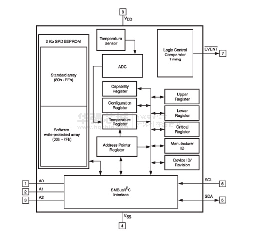 數(shù)字溫度傳感器組件具有用戶可編程寄存器DIMM的溫度傳感應(yīng)用提供能力。當監(jiān)測溫度超過了可編程限制時,該開漏事件輸出引腳是活動的,或是在報警窗口上方或下方。用戶可以選擇將事件輸出設(shè)置為一個臨界溫度輸出。該引腳可以配置為在一個比較器模式操作或在溫控器操作或中斷模式。