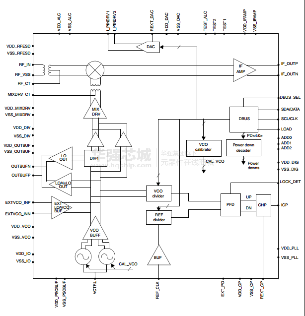 集成RF巴倫和內(nèi)部匹配允許直接50歐姆單端接口的射頻端口。如果輸出是適用于驅(qū)動(dòng)200歐姆阻抗濾波器。
