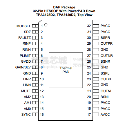 DAP(32 引腳 HTSSOP 封裝,焊盤朝下,用于 TPA3128D2 和 TPA3129D2)
