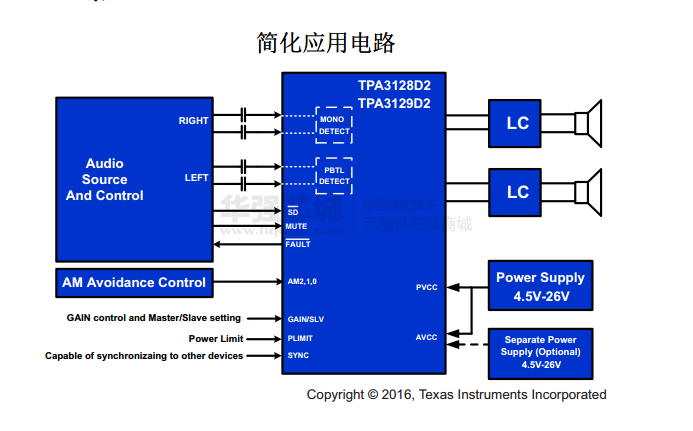 描述TPA3128D2 器件是用于驅動揚聲器的高效立體聲數字放大器功率級,并行橋接負載 (PBTL) 模式下高達 60W/2?。TPA3128D2 具有低靜態(tài)功率損耗特性,這有助于延長藍牙/無線揚聲器和其他電池供電音頻系統的電池使用壽命。TPA3128D2 器件的效率非常高,無需在雙層 PCB 上使用外部散熱器即可提供 2 × 30W 的功率。該器件建議用于高效升壓模式,這樣能夠動態(tài)減小外部 LC 濾波器的電流紋波和空閑電流。TPA3128D2 高級振蕩器/PLL 電路采用多開關頻率選項來避免 AM 干擾;搭配使用主/從模式選項時,還可使多個器件實現同步。 TPA3128D2 器件通過短路保護、過熱保護、過壓保護、欠壓保護和直流保護實現全面的故障保護。在過載情況下,器件會將故障情況報告給處理器,從而避免自身遭到損壞。特性支持多路輸出配置24V 電壓、8Ω BTL 負載條件下的功率為 2 × 30W (TPA3128D2)寬電壓范圍:4.5V 至 26V 高效 D 類運行采用推薦的 LC 濾波器配置時靜態(tài)電流超低:<23mA功率效率達 90% 以上且靜態(tài)損耗低,因此無需散熱器基于輸出功率的自適應調制機制智能放大器驅動器可降低對 RC 緩沖器的要求 多重開關頻率AM 抑制主從模式同步300kHz 至 1.2MHz 開關頻率 采用具有高 PSRR 的反饋功率級架構,降低了 PSU 需求 可編程功率限制支持并聯 BTL 模式和單通道模式 支持單電源和雙電源供電模式集成了具有錯誤報告功能的自保護電路,其中包括過壓、欠壓、過熱、直流檢測和短路等保護耐熱增強型封裝DAP(TPA3128D2 采用 32 引腳 HTSSOP 封裝,焊盤朝下) All trademarks are the property of their respective owners.