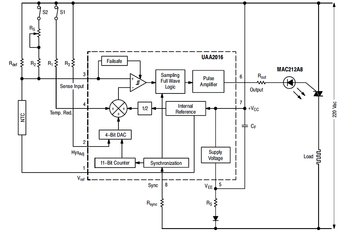 | UAA2016PG | ON | UAA2016 使用零電壓技術(shù)驅(qū)動三端雙向可控硅元件,因此可實現(xiàn)電阻負(fù)載的無 RFI 功率調(diào)節(jié)。直接基于交流電源線運行,其主要應(yīng)用為電子加熱系統(tǒng)的精密調(diào)節(jié),如板式加熱器或烙鐵。內(nèi)置的數(shù)字鋸齒波形允許在設(shè)置點的 +/-1°C 范圍內(nèi)進(jìn)行比例溫度調(diào)節(jié)操作。為了節(jié)能,有一個可編程溫度降低功能,為了實現(xiàn)安全性,傳感器故障安全將在傳感器鏈接斷開時抑制輸出脈沖。也可用于預(yù)設(shè)溫度(如除霜)應(yīng)用。在需要高遲滯的應(yīng)用中,其值可調(diào)整為設(shè)置點上下最大 5°C。所有這些功能均使用極少的外部組件實施。 | 立即購買 |