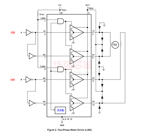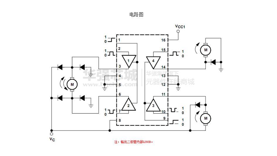 L293,外部輸出為高速鉗位二極管,應(yīng)使用電感的瞬態(tài)抑制。VCC1和VCC2分開,提供邏輯輸入,以盡量減少設(shè)備功耗。L293和 L293D的工作溫度是從0°C至70°C