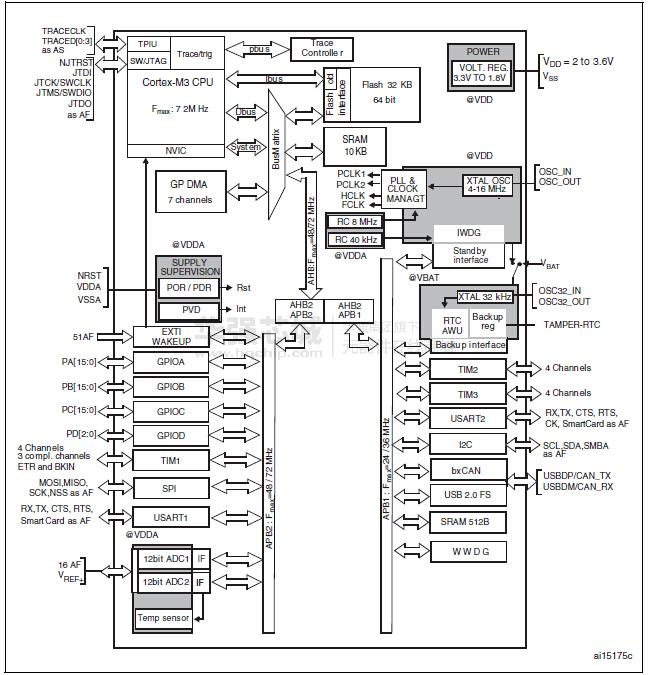 低密度表現(xiàn)的STM32F103xx系列包括四種不同的封裝類型的設(shè)備:36針64針。這取決于設(shè)備的選擇,不同的外設(shè)包括,下面的描述了設(shè)備在這個家庭提出了完整的概述。
