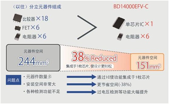 在多年積累的ROHM模擬設計技術的基礎上,由日本貴彌功株式會社提供確定規(guī)格、樣品評估等方面的支持,使以往由20個以上分立元器件完成的EDLC電池平衡功能僅通過1枚芯片即可實現(xiàn),這實屬業(yè)界首創(chuàng)※。元器件安裝空間可縮減約38%。