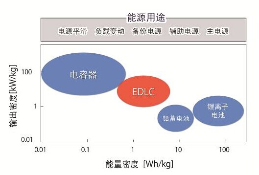 EDLC是蓄電裝置的一種,具備與鋰離子電池等二次電池相比,能量密度(單位面接的蓄電量)較差、但輸出密度(單位時間能處理的電量)較好的特征。另外,還具有反復充放電導致的性能劣化少(壽命長)、即使外部短路也不會產(chǎn)生故障(安全)、組成材料不含重金屬(環(huán)保)等優(yōu)勢。