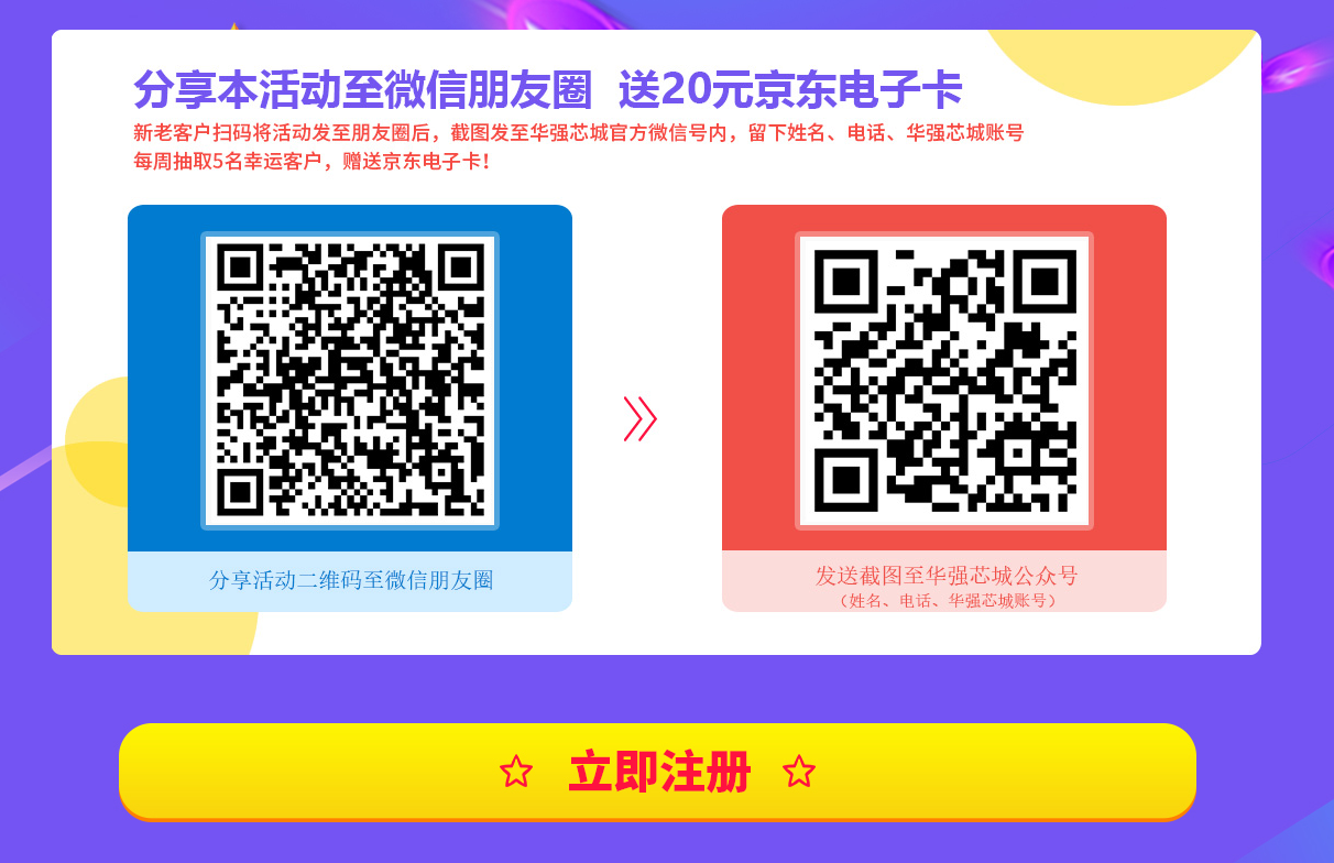 4、分享朋友圈活動(dòng),每周挑選5名客戶隨機(jī)中獎(jiǎng),中獎(jiǎng)后將在【華強(qiáng)芯城-公告】中宣布中獎(jiǎng)名單,公布名單后3個(gè)工作日會(huì)將京東卡發(fā)至您的【我的電子券】?jī)?nèi),屆時(shí)請(qǐng)查看!