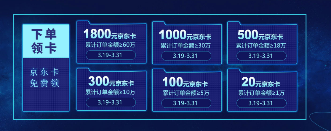 2 . 活動期間,客戶以實際付款金額(包含預(yù)付款)為準(zhǔn),實際累計成交金額達(dá)到活動金額,即可獲得相對應(yīng)的京東卡,期間產(chǎn)生的退款不計入累計金額內(nèi);