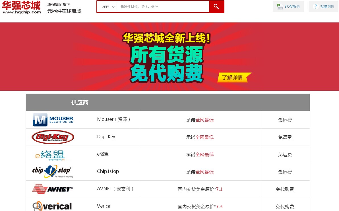 華強芯城獲得母公司華強集團資源支持,同時還與國際大型分銷商Digikey、Mouser、Avnet、Future、Element14等有良好的合作關(guān)系,產(chǎn)品庫存數(shù)量超千萬。芯城全新上線,不僅貨源有保證,還免去所有代購費。