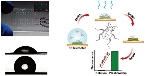 在以上研究的基礎(chǔ)上,他們受到沙漠甲蟲(Stenocara beetle)背部具有收集霧滴能力的親/疏水圖案的啟發(fā),將光子晶體熒光增強(qiáng)特性與表面浸潤(rùn)性差異相結(jié)合,利用噴墨打印技術(shù)在疏水性基底上打印制備了親水性光子晶體陣列(圖1),制備了一種具有親/疏水圖案的光子晶體陣列芯片。